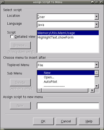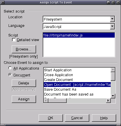 The execution of Office scripts can be bound to menu and key items and also to application or document events. These bindings can be defined via a set of Assign dialogs which can be started from the Tools/Scripting Add-on's menu